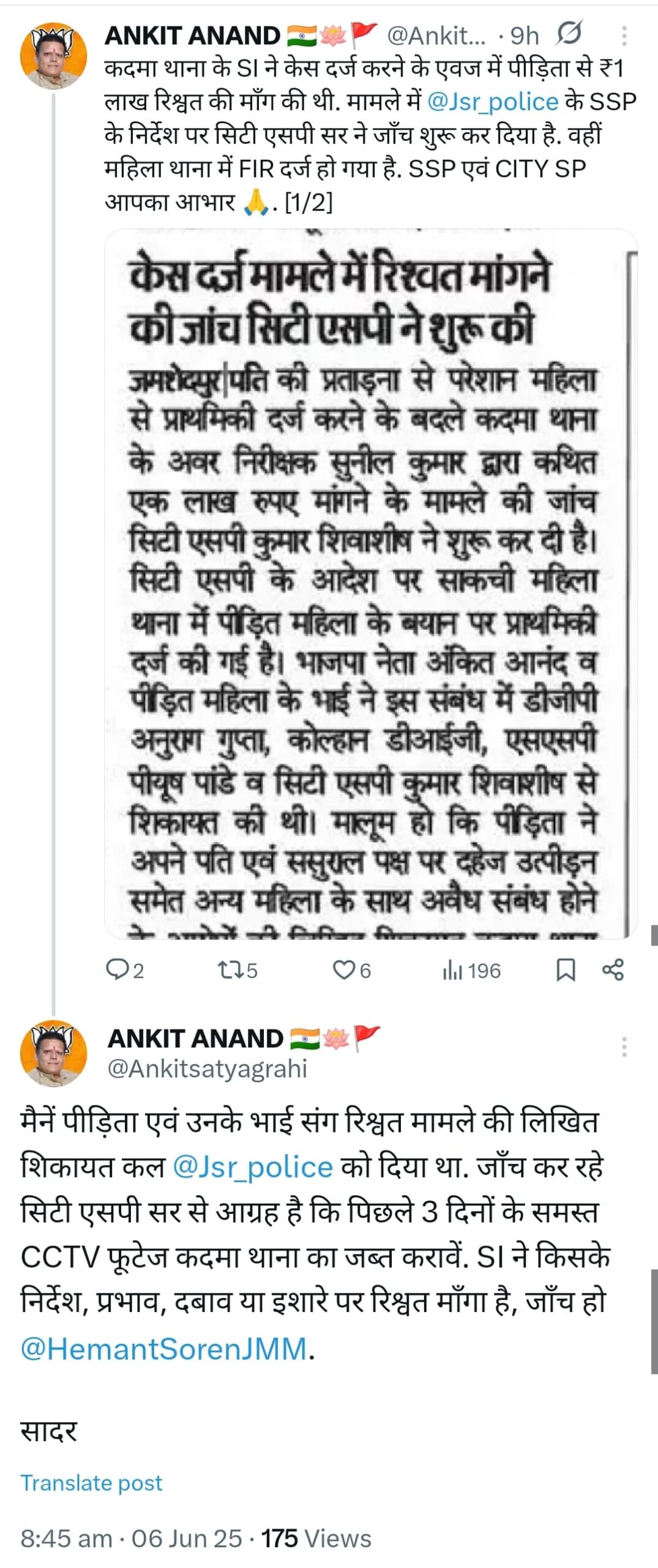 शुक्रवार को अंकित आनंद ने फिर ट्वीट कर FIR दर्ज कराने के लिए मुख्यमंत्री, एसएसपी व सिटी एसपी का आभार जताया। साथ ही सुझाव दिया कि जांच सिर्फ एक सब-इंस्पेक्टर तक सीमित न रहे बल्कि कदमा थाना के पूरे सिस्टम की जांच होनी चाहिए। उन्होंने पिछले 3 दिनों के सभी CCTV फुटेज जब्त करने की मांग की है। कहा कि किसके प्रभाव, दबाव या इशारे पर एस.आई. ने एक लाख रुपये रिश्वत का डिमांड किया इसका खुलासा सिटी एसपी को करना चाहिए।