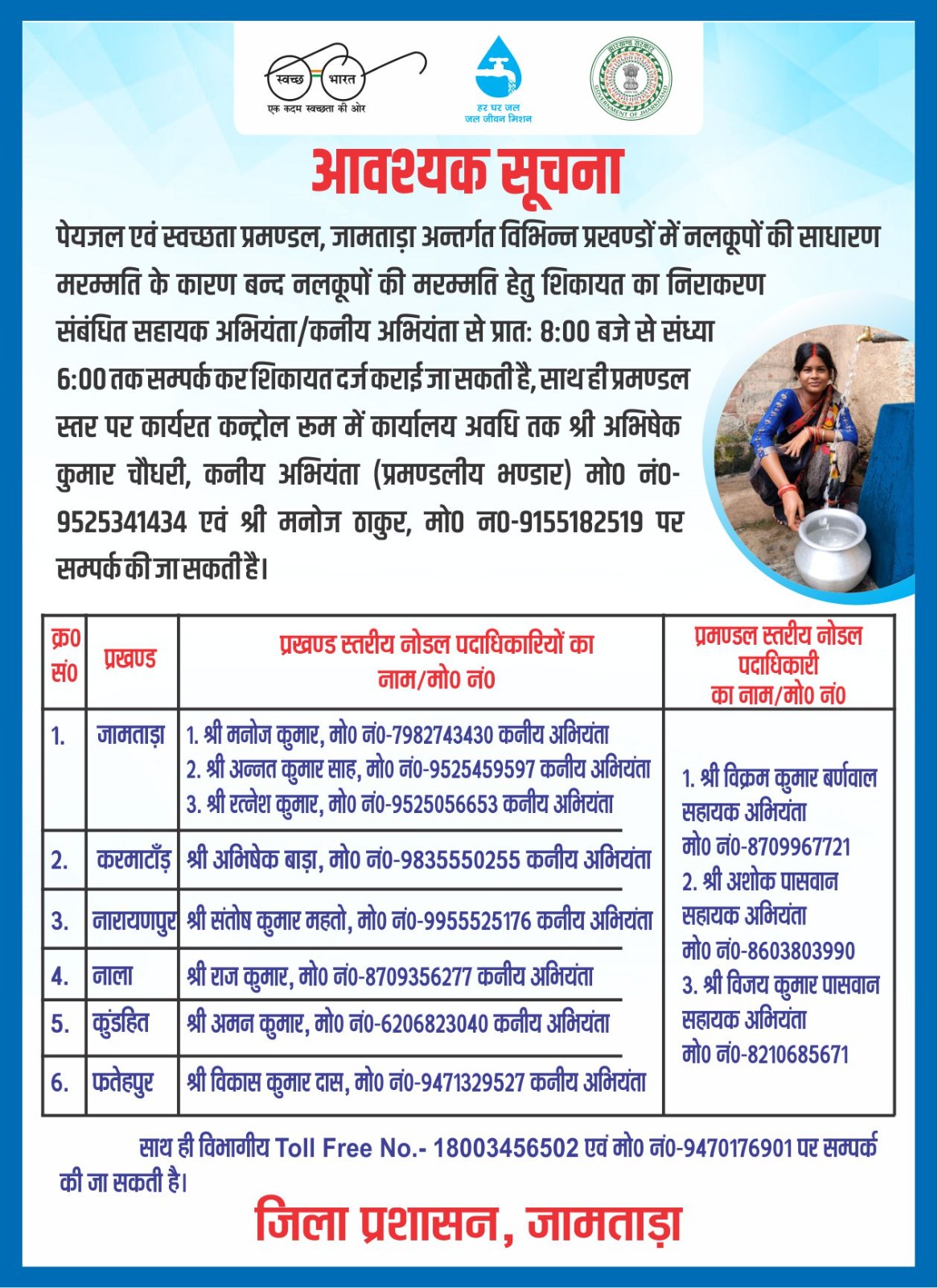 जामताड़ा: बढ़ती गर्मी और संभावित जल संकट को देखते हुए जिला प्रशासन ने पेयजल समस्याओं के त्वरित समाधान के लिए जिला एवं प्रखंड स्तर पर कंट्रोल रूम का गठन किया है। इसके तहत विभिन्न अधिकारियों की प्रतिनियुक्ति करते हुए उनके संपर्क नंबर जारी किए गए हैं, ताकि आम लोग अपनी शिकायतें दर्ज करा सकें।