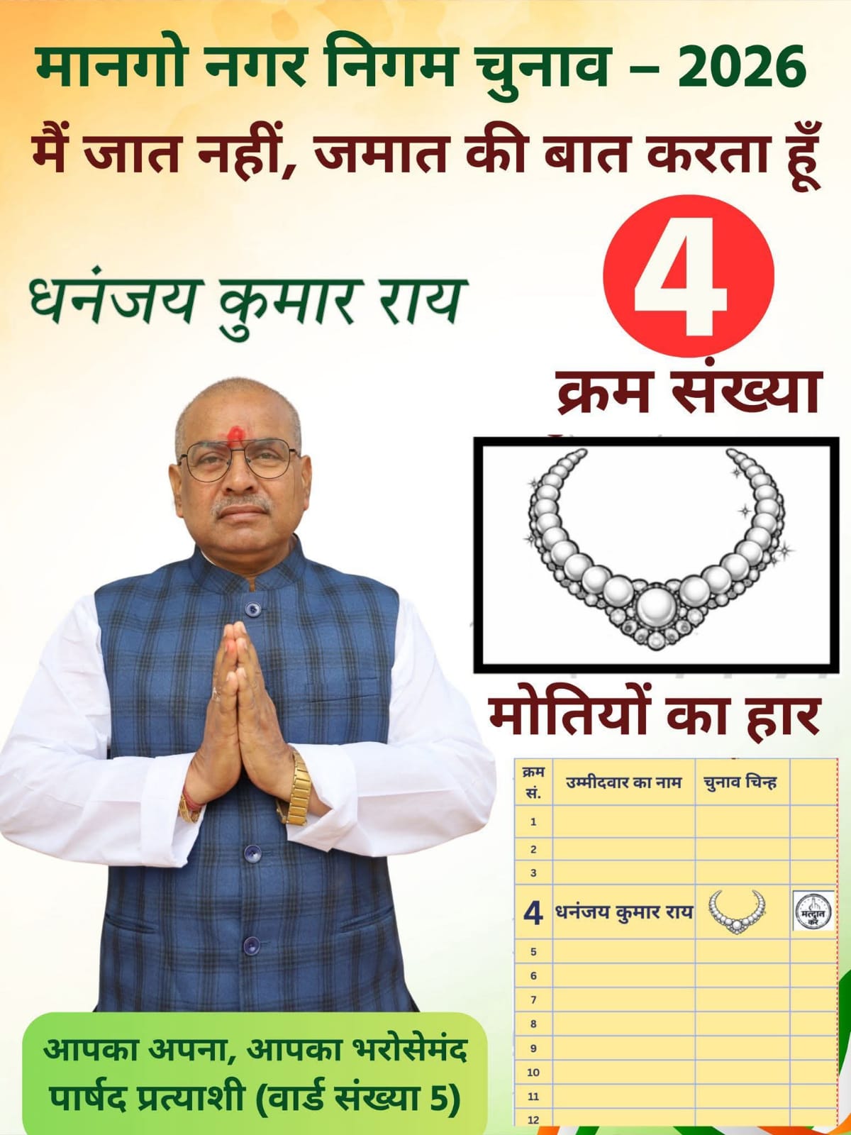 धनंजय कुमार राय ने मतदाताओं से 23 फरवरी को क्रम संख्या 4, चुनाव चिन्ह ‘मोतियों का हार’ पर अपना बहुमूल्य मत देकर उन्हें अधिक से अधिक मतों से विजयी बनाने का आग्रह किया। उन्होंने कहा कि यह जीत पूरे वार्ड की जीत होगी और क्षेत्र के समग्र विकास का मार्ग प्रशस्त करेगी।