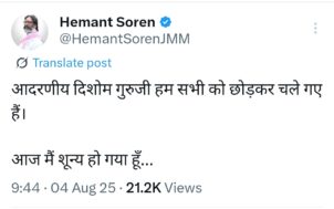 दिशोम गुरू शिबू सोरेन का निधन, झारखंड में शोक की लहर