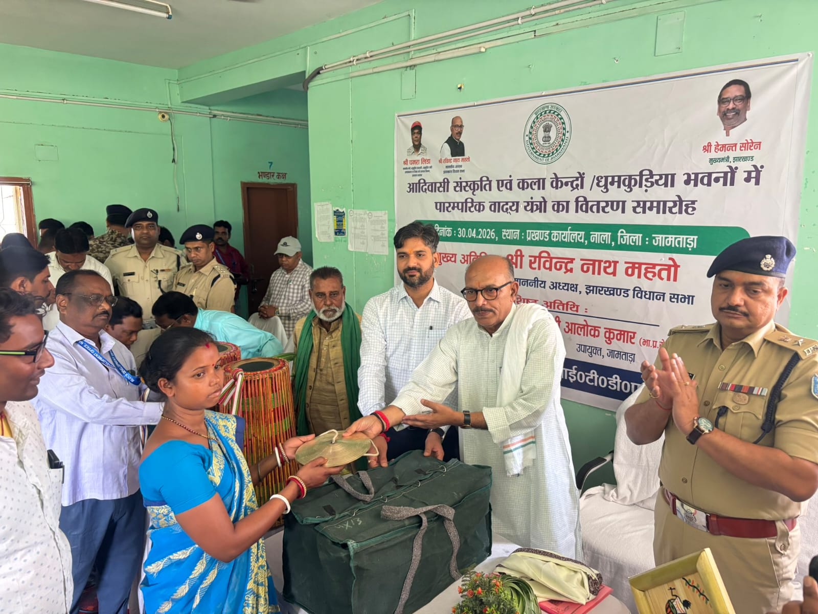 जामताड़ा: नाला प्रखंड परिसर में आईटीडीए/कल्याण विभाग की ओर से प्रखंड के सभी पंचायतों के आदिवासी संस्कृति एवं कला केंद्रों तथा धुमकुड़िया भवनों के लिए पारंपरिक वाद्ययंत्र वितरण कार्यक्रम आयोजित किया गया। कार्यक्रम का शुभारंभ झारखंड विधानसभा अध्यक्ष रवींद्रनाथ महतो, उपायुक्त आलोक कुमार, पुलिस अधीक्षक शम्भू कुमार सिंह और परियोजना निदेशक आईटीडीए जुगनू मिंज सहित अन्य अतिथियों ने किया।