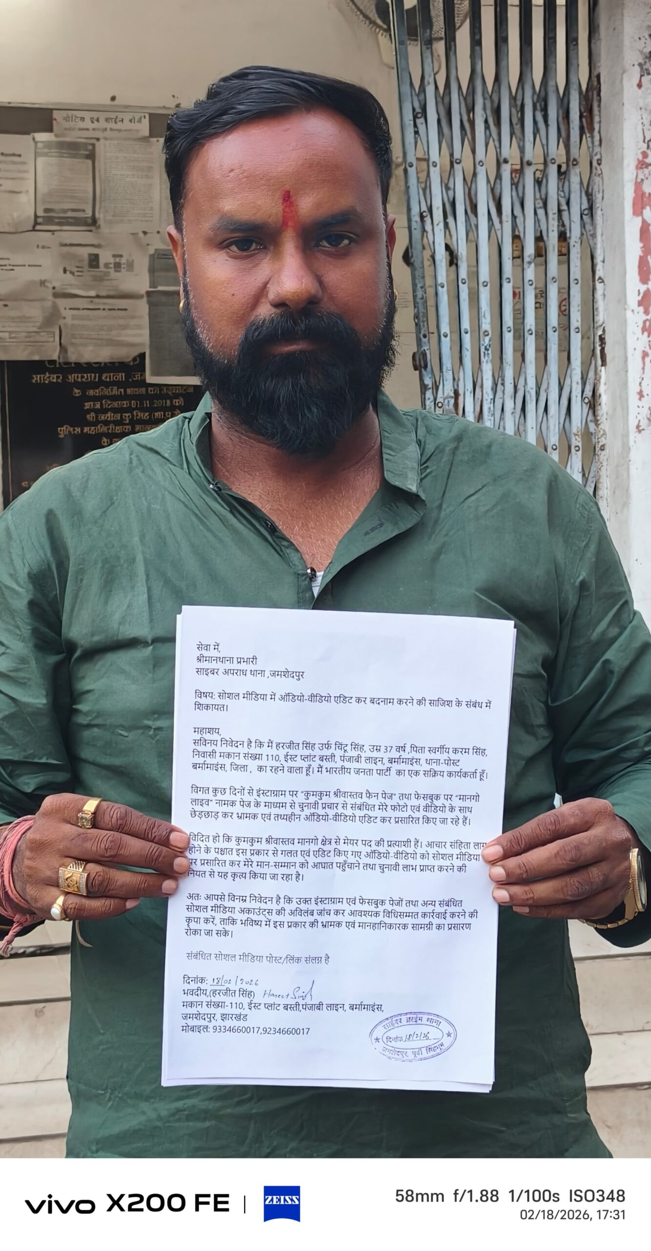 हरजीत सिंह चिंटू ने कहा कि मैं भारतीय जनता पार्टी के सक्रिय कार्यकर्ता हु और मेरे खिलाफ इंस्टाग्राम पर “कुमकुम श्रीवास्तव फैन पेज” तथा फेसबुक पर “मानगो लाइव” नामक पेजों के माध्यम से उनके चुनावी कार्यक्रमों के फोटो और वीडियो के साथ छेड़छाड़ कर भ्रामक एवं मनगढ़ंत ऑडियो-वीडियो वायरल किए जा रहे हैं।
