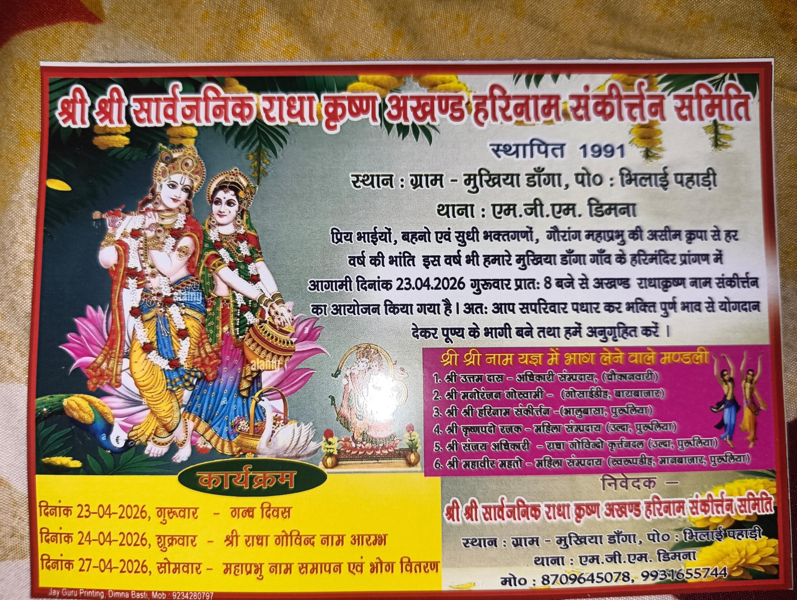 हर वर्ष की तरह ईस वर्ष भी श्री श्री सार्वजनिक राधा कृष्ण अखण्ड हरिनाम संकीर्तन समिति कि से ओर nh-33 मुखिया डांगा MGM में 24.04.26 से 27.04.26 तक हरिनाम संकीर्तन का आयोजन किया गया है ओर इसमें भाग लेने वाले मण्डली श्री उत्तम दास ,(चोका नवारी), श्री मनोरंजन गोस्वामी (बराबाजार प.बगाल ), श्री श्री हरिनाम संकीर्तन (पुरूलिया प.बगाल), श्री कृष्णपदो रजक (महिला मण्डली पुरूलिया प.बगाल), श्री सजल अधिकारी (पुरूलिया प. बंगाल), श्री महावीर महतो(मानबाजर पुरूलिया) के मंडली अपनी कला और धुन से क्षेत्र में हरिनाम संकीर्तन से क्षेत्र भक्ति रस में सराबोर हो उठेगा और ईस कार्यक्रम में सभी को सादर आमंत्रित हैं और सांस्कृतिक परंपराओं सशक्त करने के समिति के लोग अथक प्रयास कर रहे हैं ताकि भक्तगणों को कोई परेशानी न हो