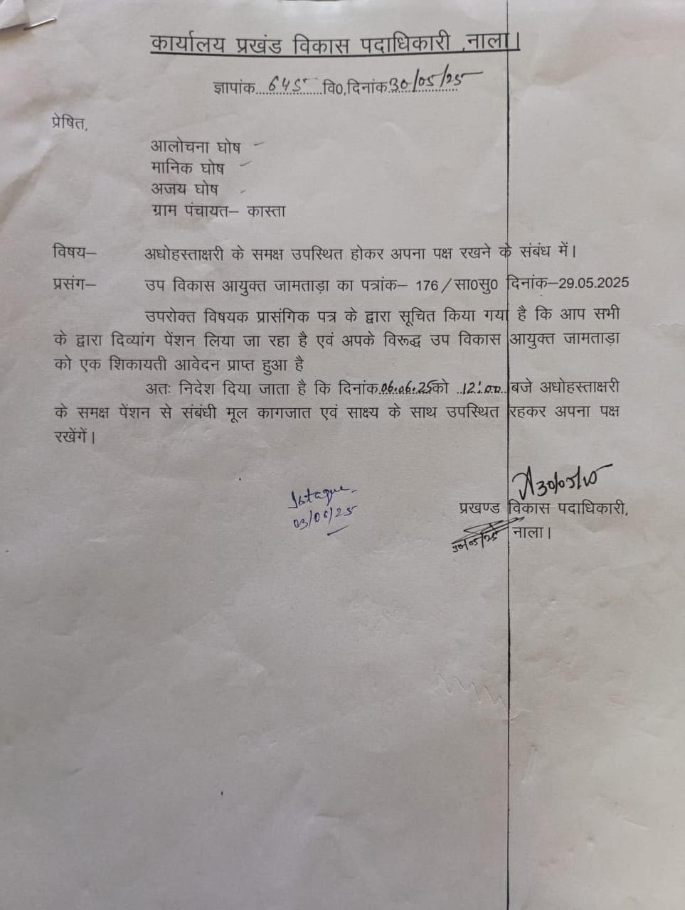 जामताड़ा: नाला प्रखंड अंतर्गत कास्ता पंचायत के कालीपहाड़ी निवासी आलोचना घोष, मानीक घोष और अजय घोष पिछले लगभग चार वर्षों से दिव्यांग पेंशन का लाभ उठा रहे हैं।जो कि फर्जी रूप से योजना का लाभ ले रहे है।उक्त बाते सूत्र के अनुसार बतायी जा रही है। सूत्रों के अनुसार, किसी ने इस मामले की शिकायत प्रशासन को किया था। शिकायत की गंभीरता को देखते हुए डीडीसी के निर्देश पर नाला प्रखंड विकास पदाधिकारी के कार्यालय से इन तीनों को नोटिस भी जारी किया गया।