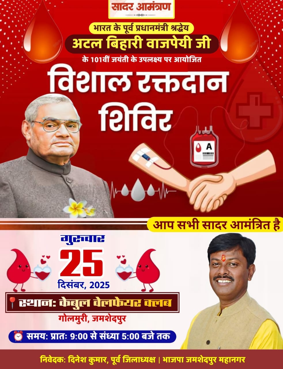 भारत रत्न एवं पूर्व प्रधानमंत्री श्रद्धेय अटल बिहारी वाजपेयी जी की 101वीं जयंती के अवसर पर 25 दिसंबर 2025 को जमशेदपुर के केबुल वेलफेयर क्लब, गोलमुरी में 22वें विशाल रक्तदान शिविर का आयोजन किया जाएगा। रक्तदान सुबह 9 बजे से शाम 5 बजे तक किया जा सकेगा।