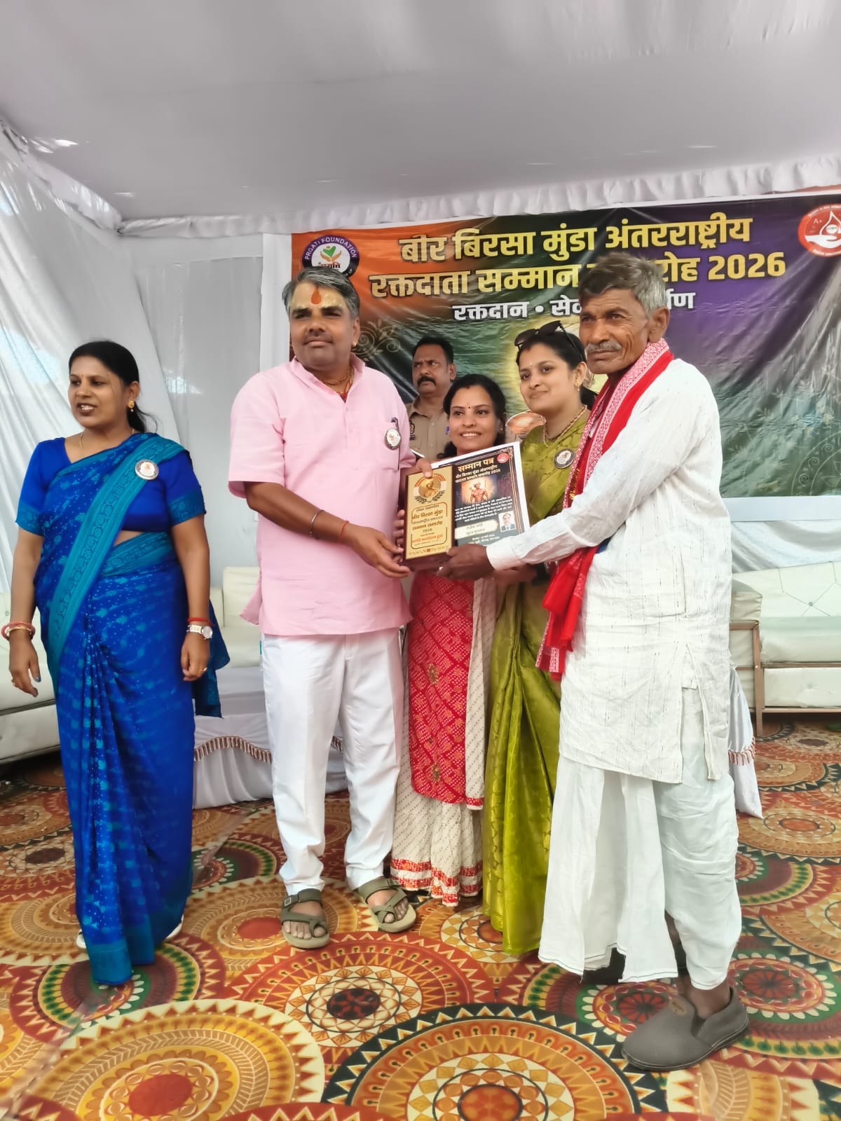 43वे बार रक्तदान कर चुकी समाजसेवी डाँ.संजुक्ता आचार्या चटर्जी को वीर बिरसा अंतरराष्ट्रीय रक्तदाता सम्मान मिला।