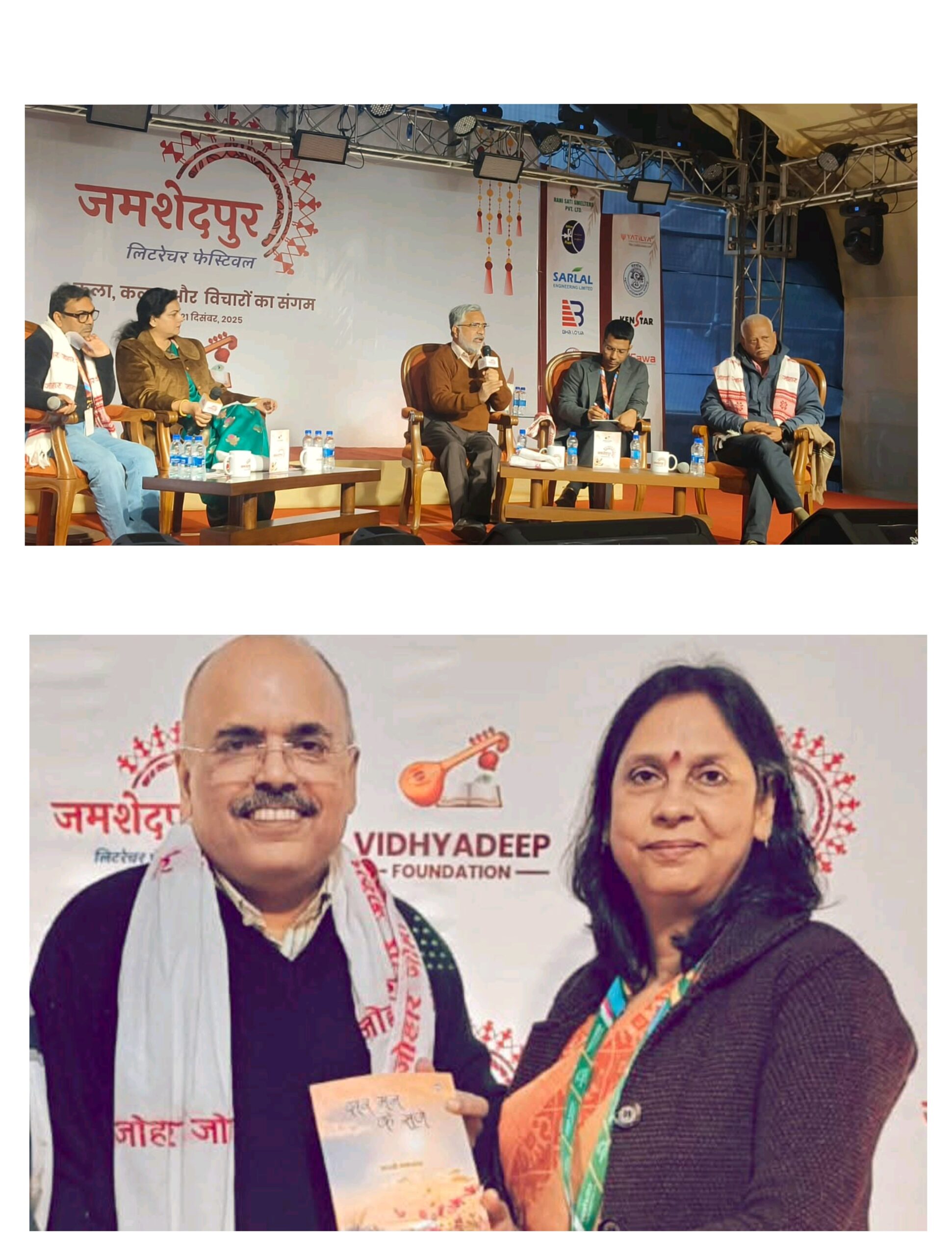 इससे पूर्व जमशेदपुर साहित्य उत्सव के प्रथम दिन एक यादगार साहित्यिक क्षण भी देखने को मिला, जब लेखिका माधवी उपाध्याय ने अपनी पुस्तक “द्वार मन के सजे” प्रभात खबर के संपादक श्री संजय मिश्रा, राजेश जैस एवं वरिष्ठ साहित्यकार श्री दामोदर खड़से को भेंट की। यह पल साहित्यिक संवाद और सृजनात्मक साझेदारी का प्रतीक बना।